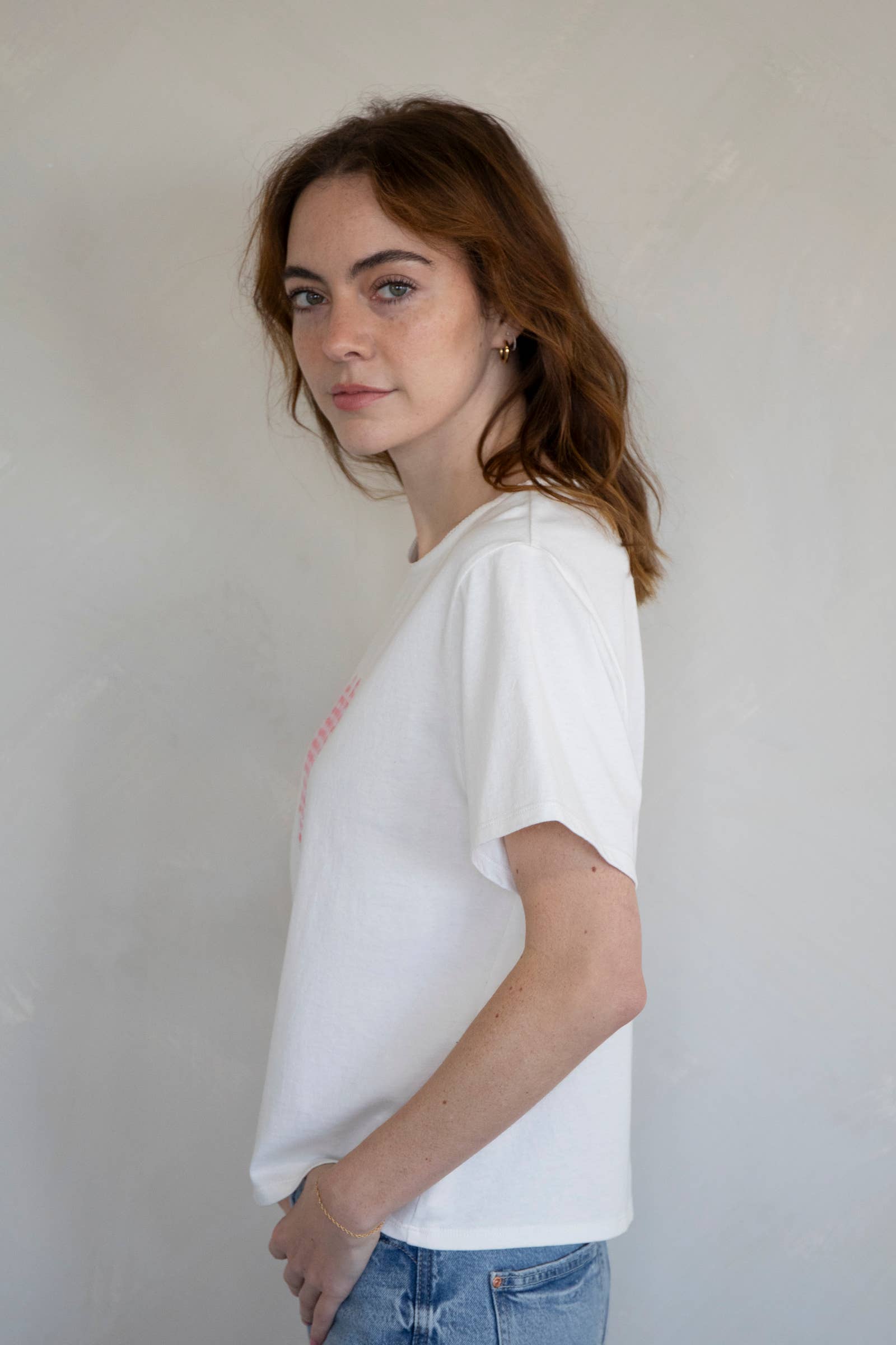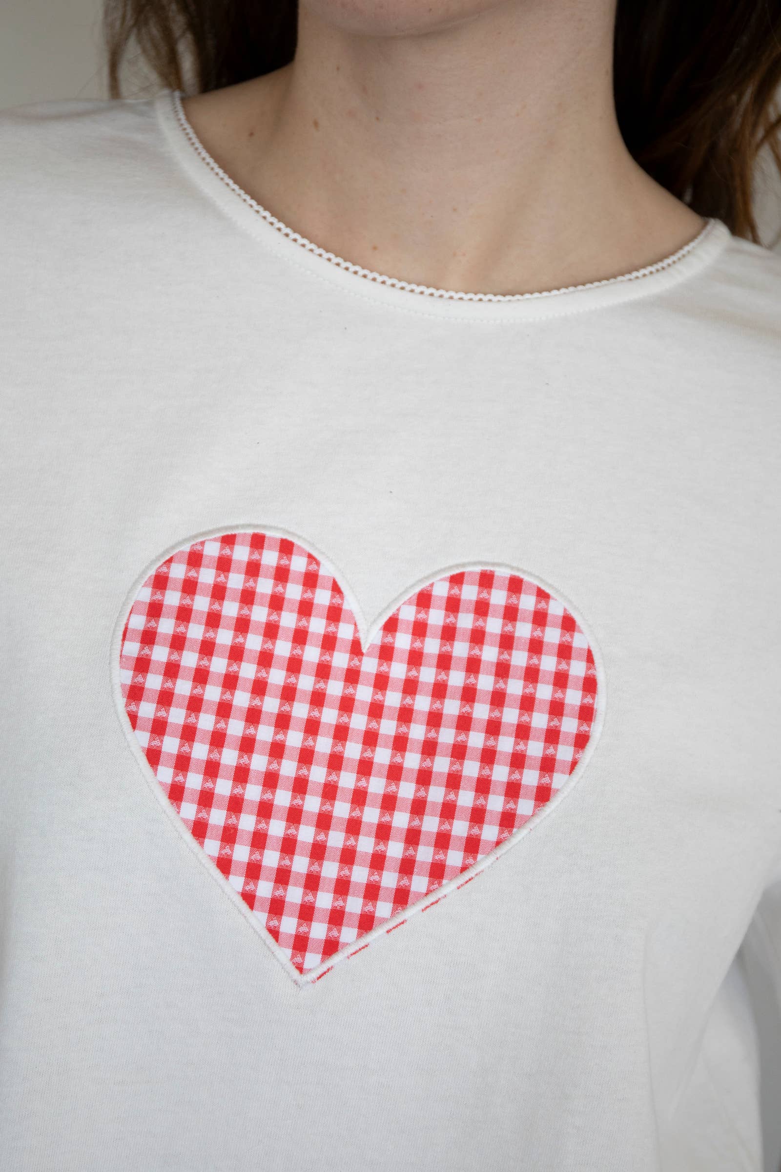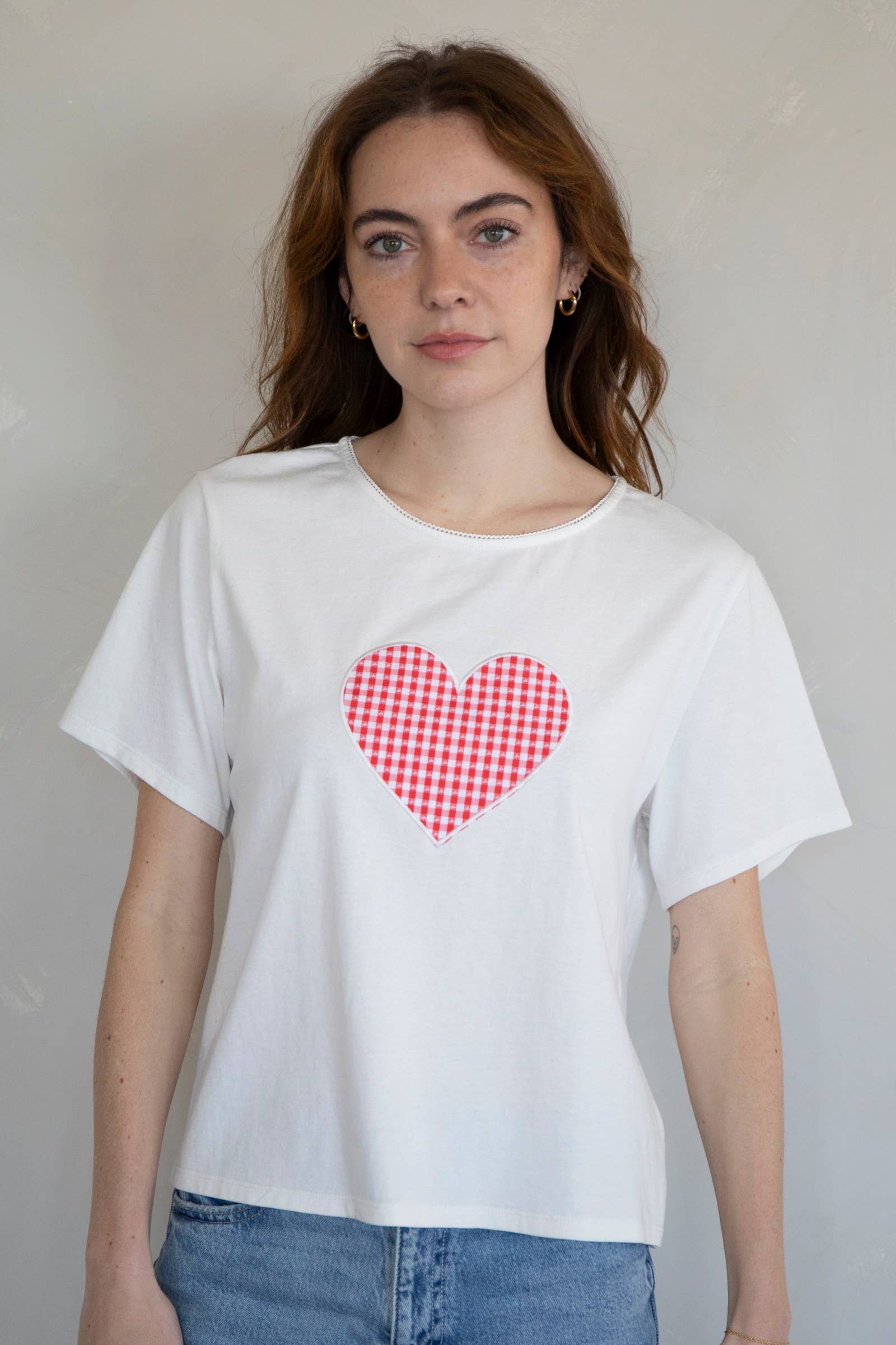 Adorable gingham-patterned heart appliqué brings a sweet, whimsical touch to this classic tee. Perfect for adding a dash of charm to your everyday wardrobe.