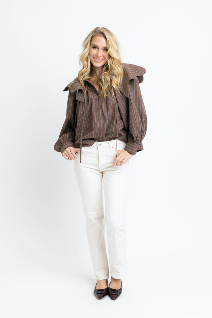 Featuring a distinctive scalloped collar that frames the neckline with refined detail, this oversized top showcases a warm brown stripe pattern and relaxed boxy silhouette. The generous collar design wraps elegantly around the shoulders, making it an ideal choice for autumn gatherings and seasonal celebrations.