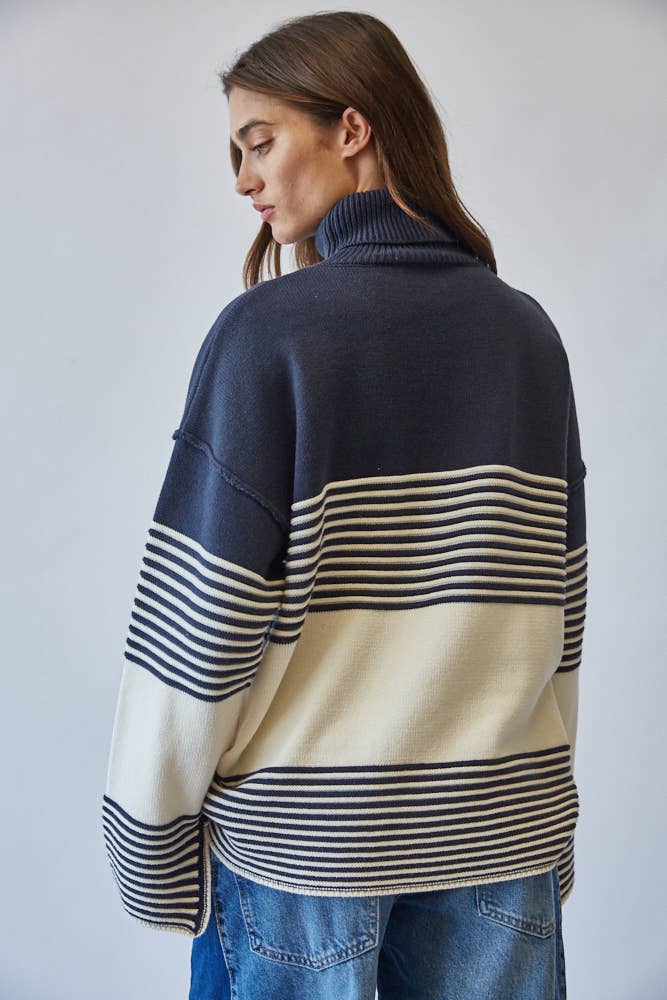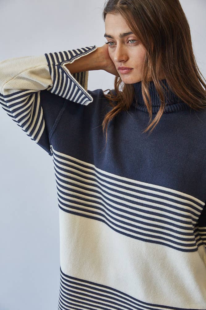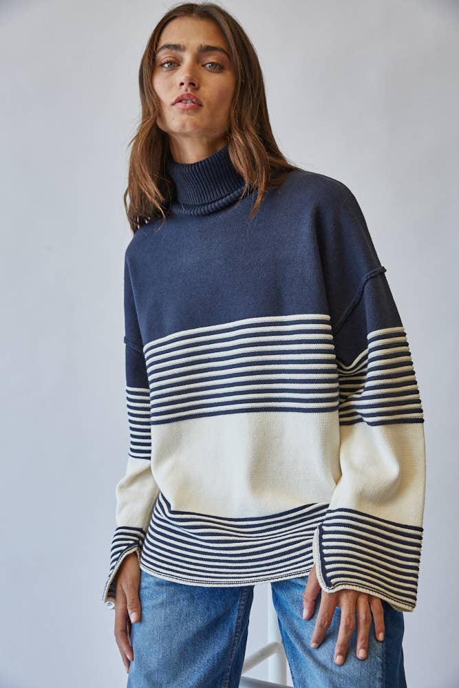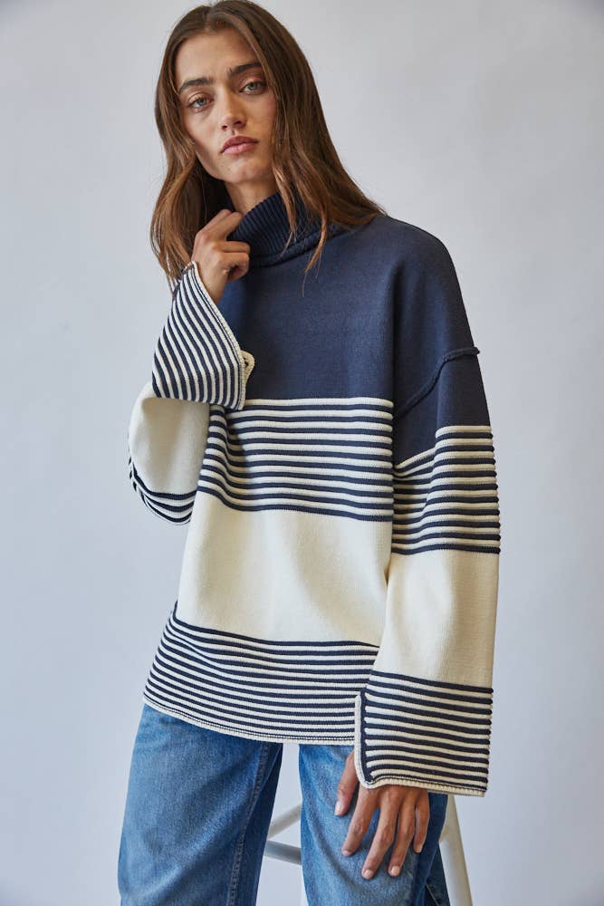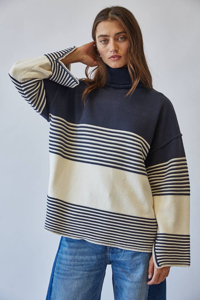 Effortlessly chic, this striped turtleneck sweater channels a modern mariner vibe with its bold navy and ivory palette.