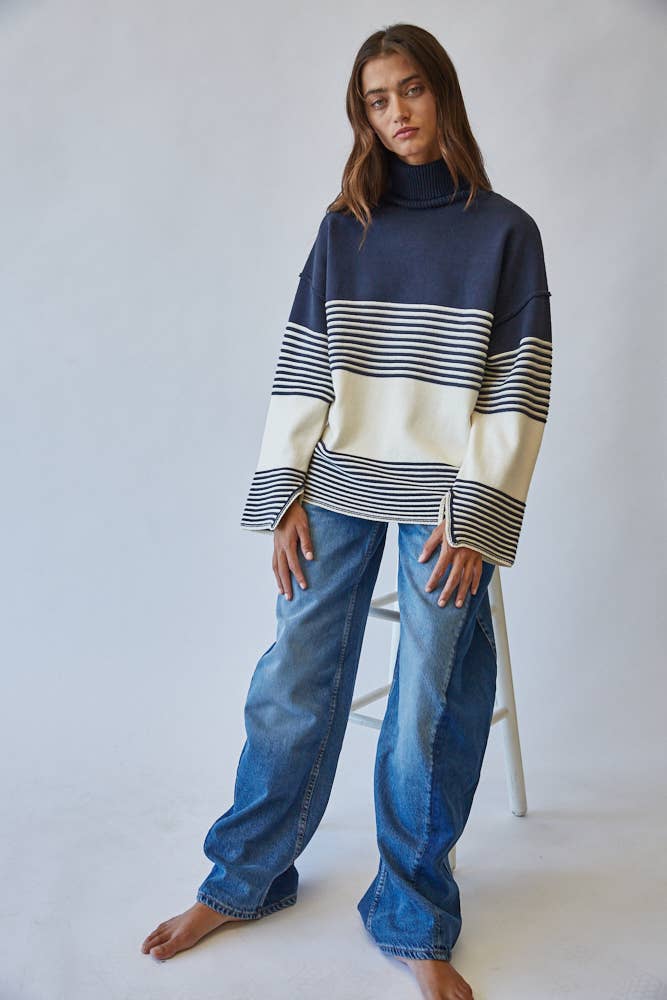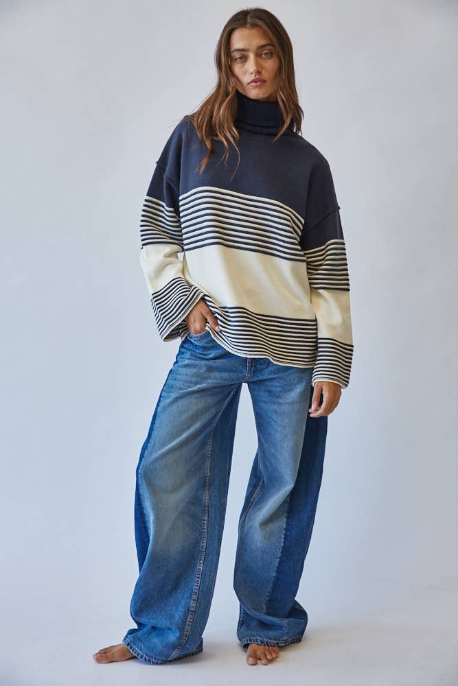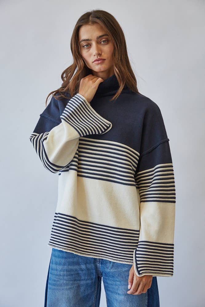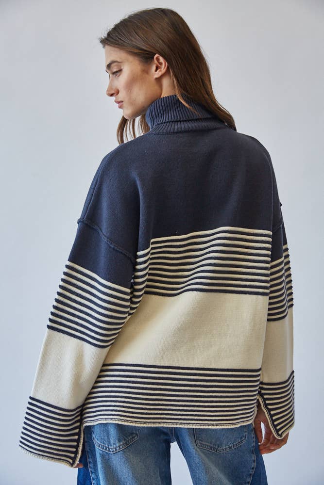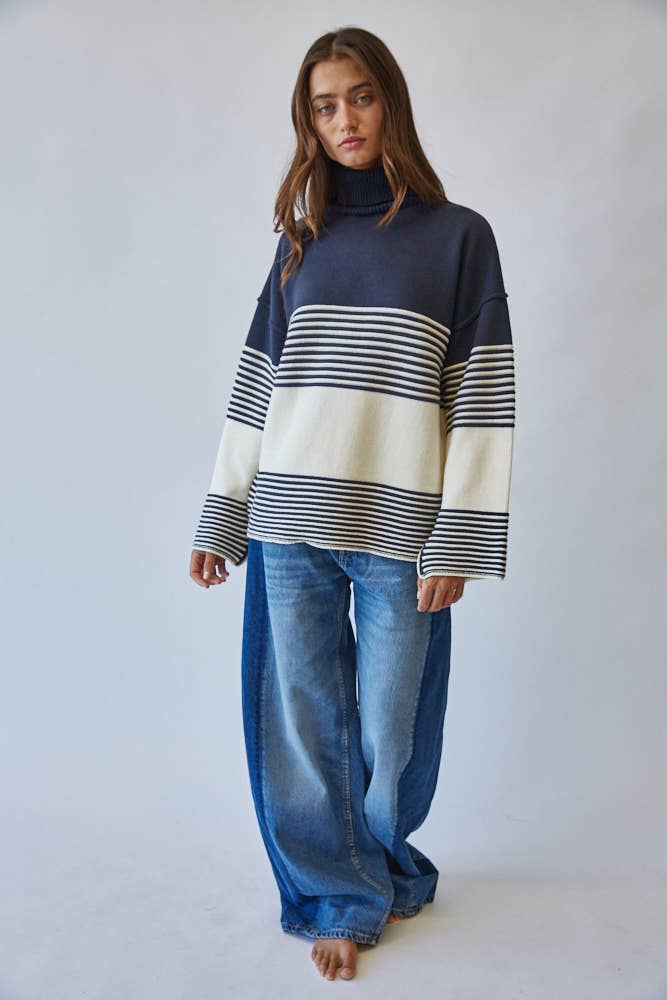 Effortlessly chic, this striped turtleneck sweater channels a modern mariner vibe with its bold navy and ivory palette.