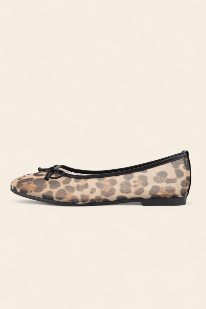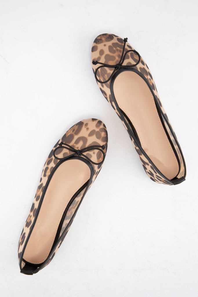 MESH LEOPARD PRINTED BALLET FLAT TRIMMED WITH BLACK AND FINISHED WITH A BLACK BOW