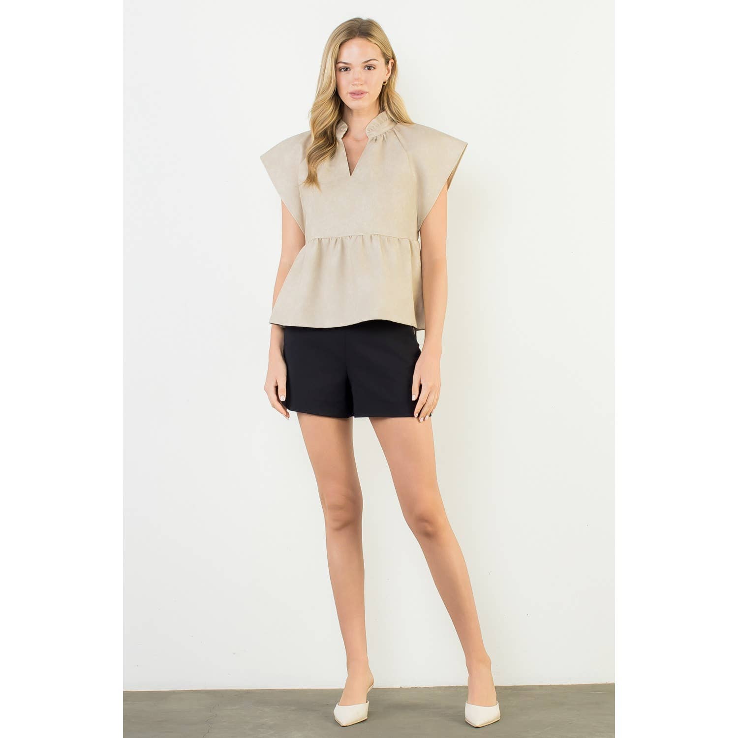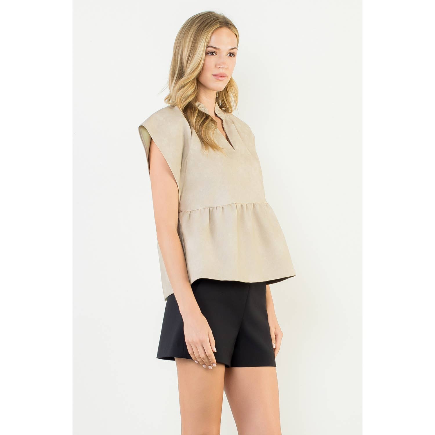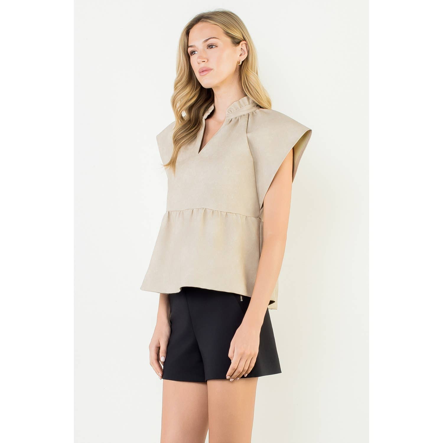 Elevate your everyday style with this cheeky pleather V-neck top that means business—and fun. The structured peplum waist creates an instant hourglass silhouette, while the ruffled collar adds a flirty touch of personality. Crafted in soft beige pleather with short sleeves, it's the perfect piece for dressing up basics or standing out at casual gatherings. Versatile enough for the office, bold enough for brunch.