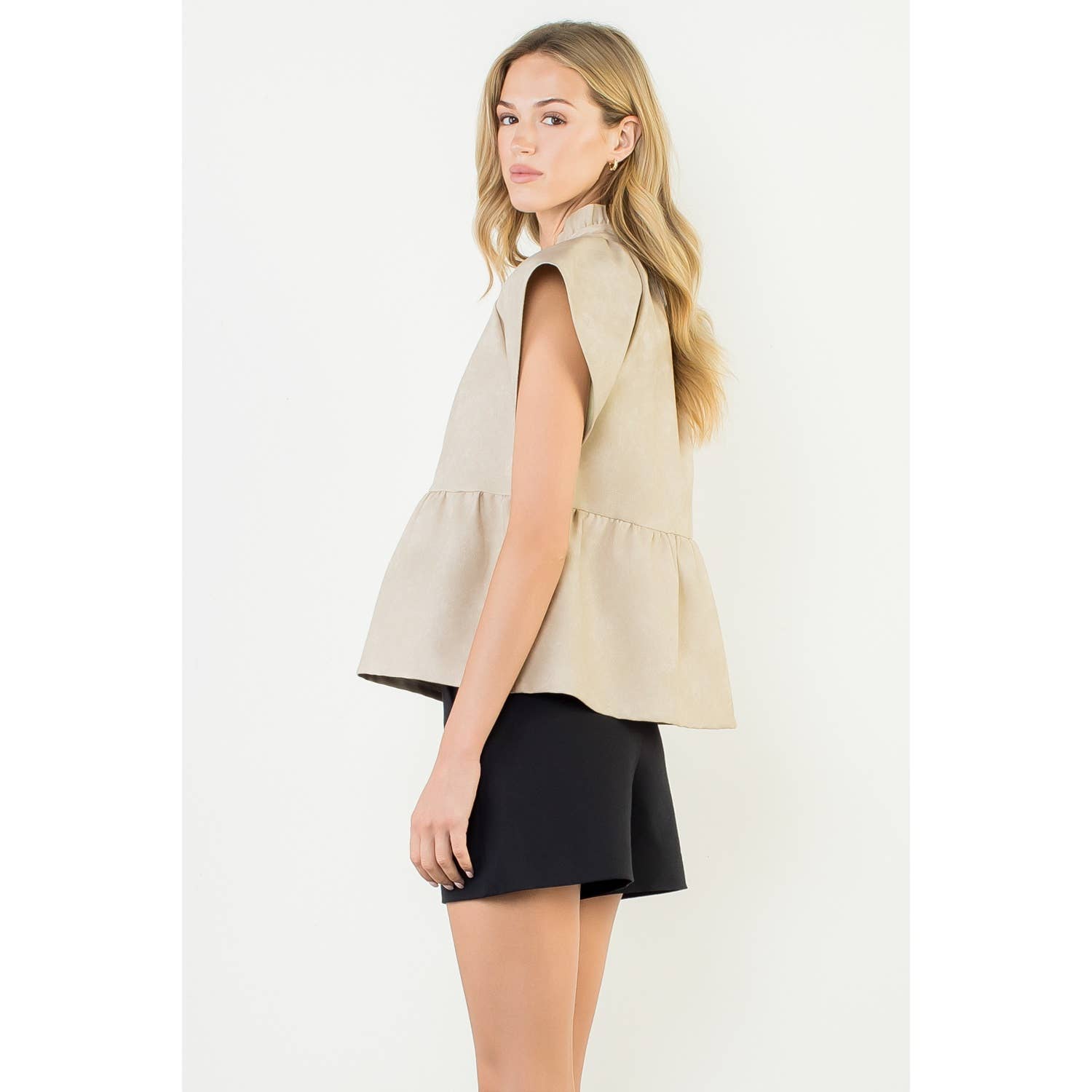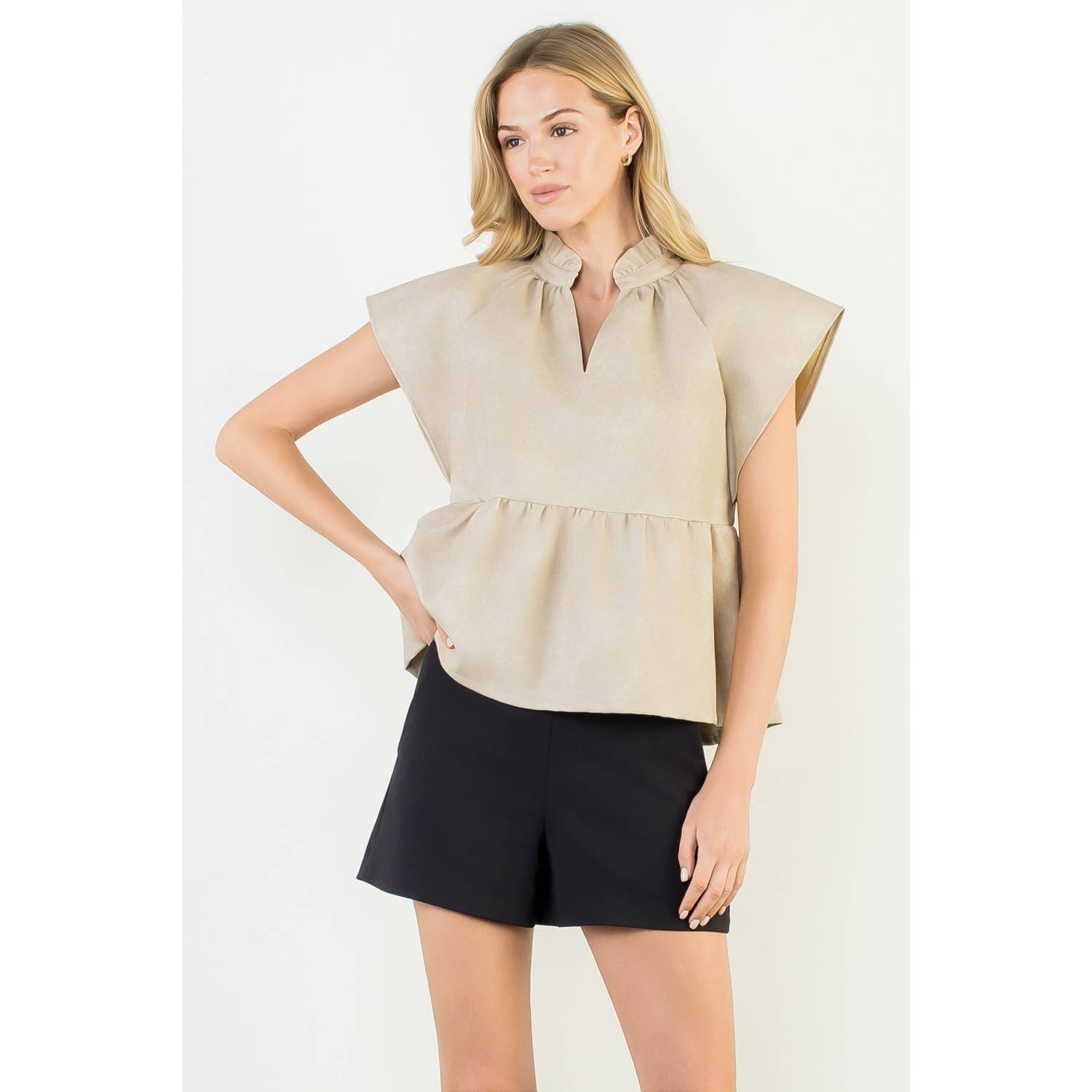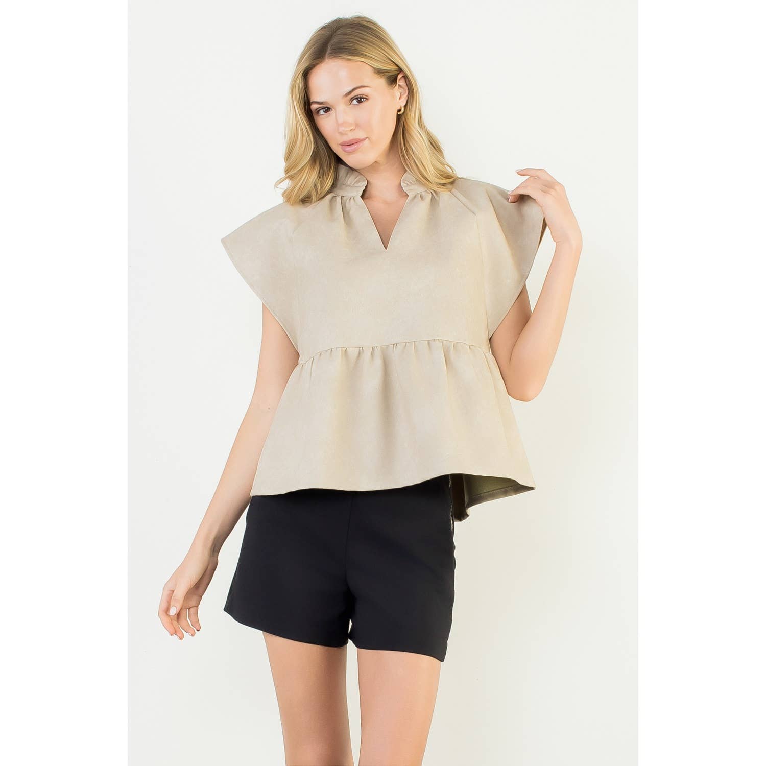 Elevate your everyday style with this cheeky pleather V-neck top that means business—and fun. The structured peplum waist creates an instant hourglass silhouette, while the ruffled collar adds a flirty touch of personality. Crafted in soft beige pleather with short sleeves, it's the perfect piece for dressing up basics or standing out at casual gatherings. Versatile enough for the office, bold enough for brunch.