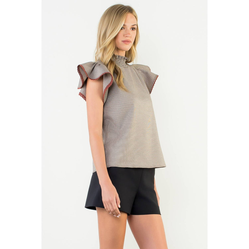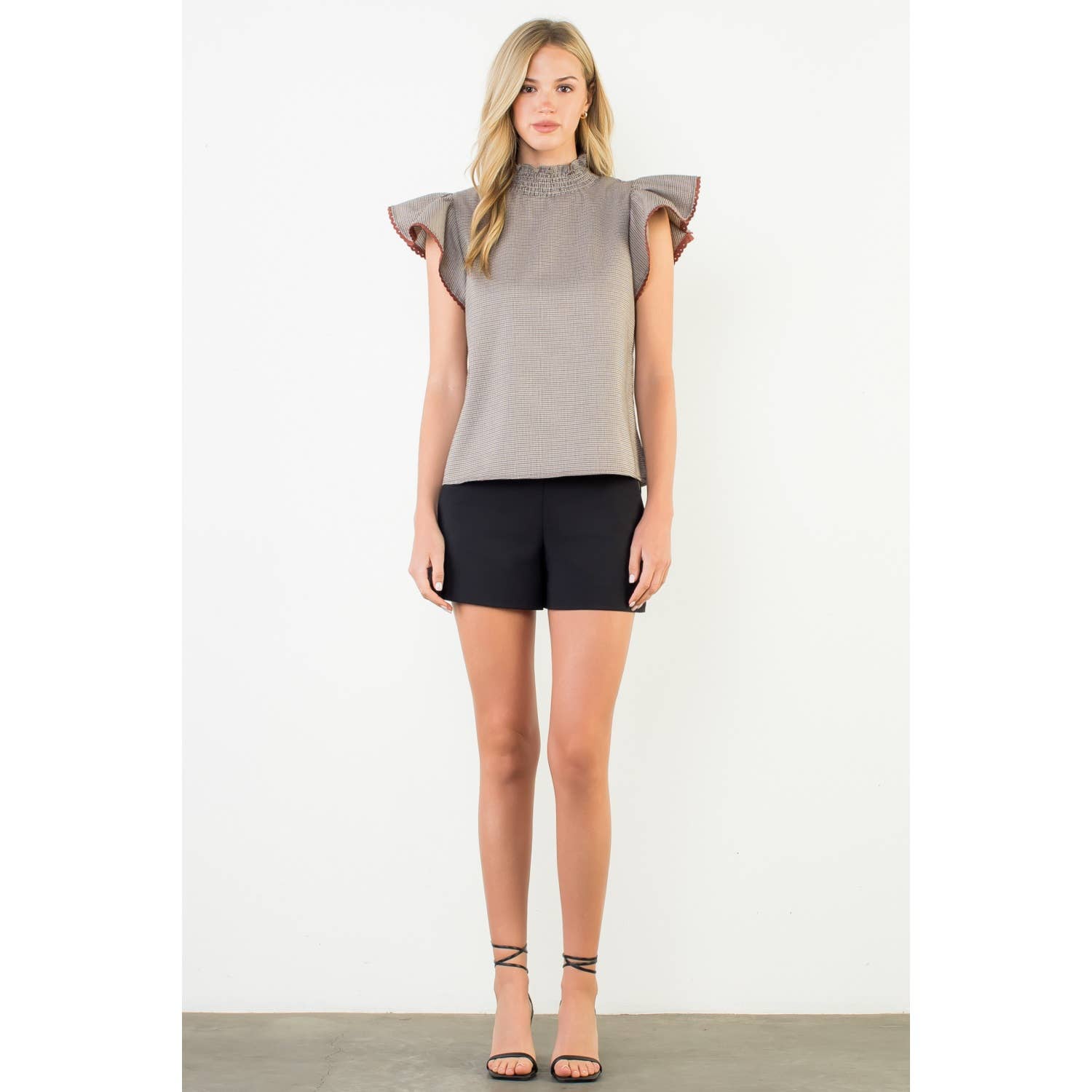 Smocked Neck Flutter Sleeve Houndstooth Top