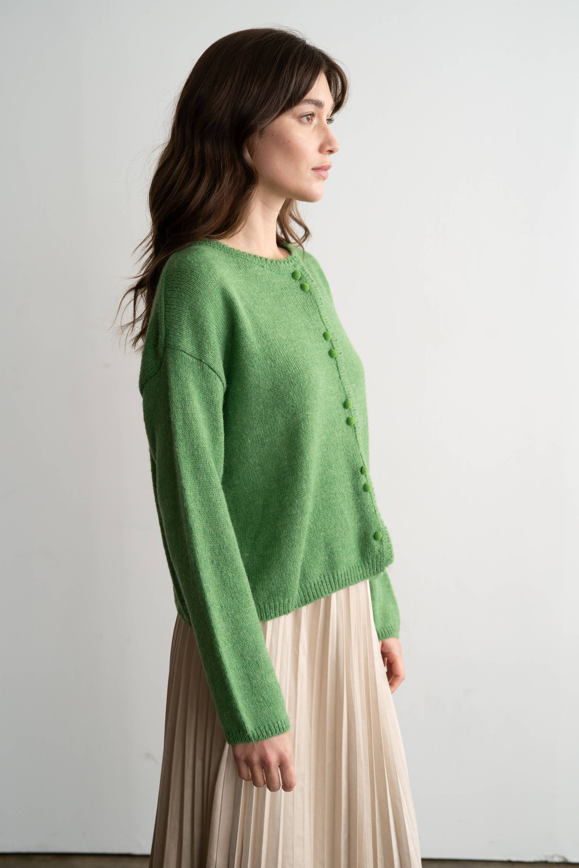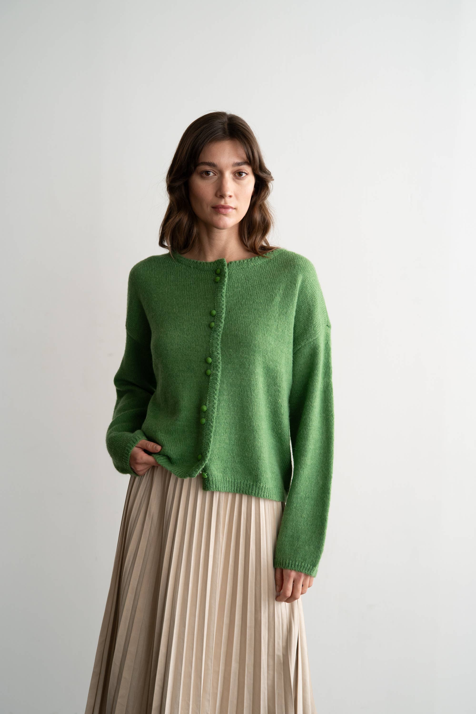 Crafted from premium wool with a luxuriously soft knit, this cardigan delivers understated sophistication for daily wear. The refined crew neckline provides timeless appeal, while fabric-covered buttons add a distinctive finishing touch. An intentionally relaxed silhouette with dropped shoulders creates an effortlessly polished aesthetic that transitions seamlessly from casual to elevated styling—pair with tailored trousers, flowing dresses, or structured skirts for versatile wardrobe coordination.